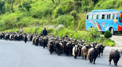 बागलुङ । उपल्लो मुस्ताङदेखि च्याङ्ग्रा लिएर पोखरा झर्दै गर्नुभएका मुगुका छिरिङ छोर्वे लामा शुक्रबार दिउँसो लुम्लेमा भेटिए । साढे दुई सय च्याङ्ग्रा लिएर आफू आठ दिनअघि उपल्लो मुस्ताङबाट हिँडेको सुनाए ।