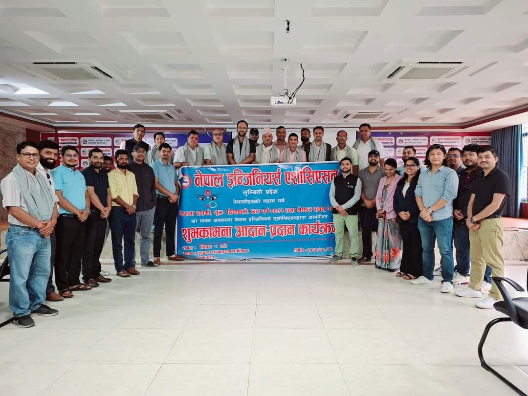 बुटवल । नेपाल इन्जिनियर्स एसोसिएसन स्वागत नेपाल इन्जिनियर्स एसोसियसन लुम्बिनी प्रदेश समितिद्वारा बिजयदशमी, शुभदिपावली तथा छठ पर्वको पावन अवसरमा शुभकामना आदानप्रदान कार्यक्रम सम्पन्न गरेको छ ।