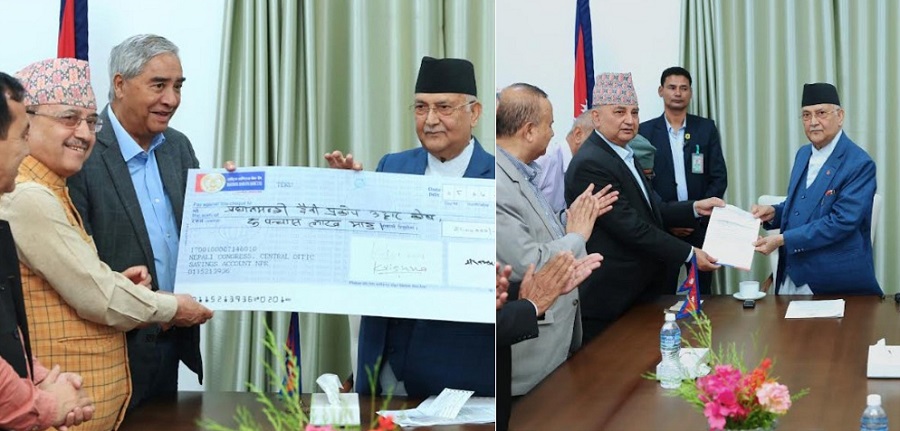 नेपाली कांग्रेसका सभापति तथा पूर्वप्रधानमन्त्री शेरबहादुर देउवाले आज प्रधानमन्त्री केपी शर्मा ओलीलाई भेट गरी ५० लाख रकम बराबरको चेक हस्तान्तरण गरेका छन् ।