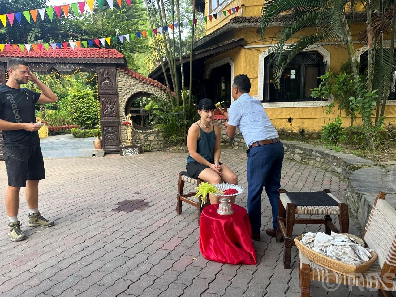 सौराहास्थित सपना भिलेजका प्रबन्ध निर्देशक धुव्र गिरीले बाह्य पर्यटकहरुलाई टीका र जमरा लगाइदिएका छन् । साथै उनले पर्यटकको सेवाका लागि दसैँका दिन पनि होटल खुला राखेको बताए । पालैपालो टीका र जमरा लगाउँदा बाह्य पर्यटकहरु दङ्ग भएका छन् । फ्रान्स, जर्मन र नेदरल्याण्डका गरी २६ जनाले यहाँ दसैँको टीका र जमरा लगाए ।