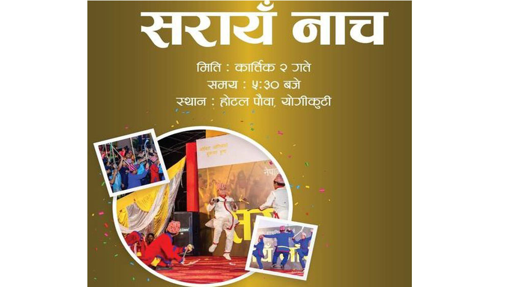 बुटवल । नेपालीहरुको विभिन्न चाडपर्वमा परम्पराअनुसारका गतिविधिहरु गर्दै आएको होटल पौवाले यस वर्षको बडादशैँको अवसरमा आज (शुक्रबार) साँझ सराँय नाच प्रस्तुत गर्दै छ । होटल पौवाको तिलोत्तमा–३ योगिकुटीमा रहेको शाखाले गुल्मी छत्रकोट गाउँपालिका–१ हुँगाका कलाकारहरु ल्याएर सराँय नाच प्रस्तुत गर्न लागेको हो ।