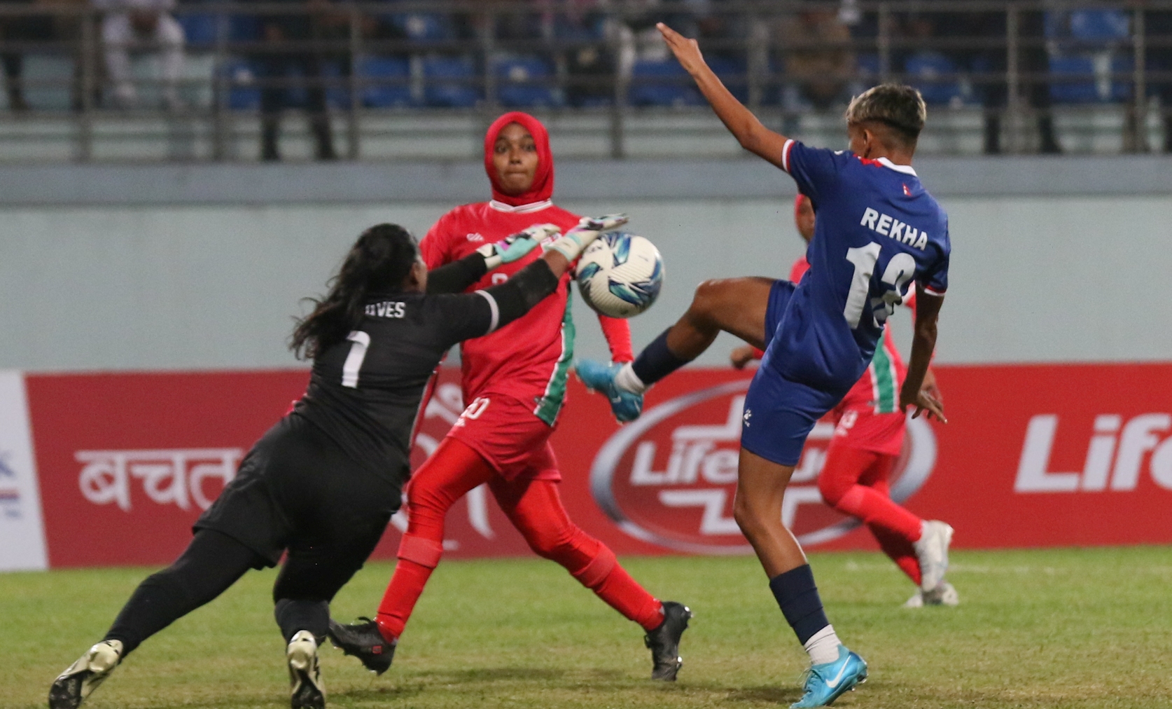 त्रिपुरेश्वरस्थित दशरथ रङ्गशाला आज भएको खेलमा नेपालले माल्दिभ्सलाई ११–० गोलअन्तरले पराजित गर्दै विजयी भएको हो । नेपालका लागि रेखा पौडेलले पाँच गोल गरिन् भने प्रीति राईले ह्याट्रिक पूरा गरिन् । यसैगरी सविता राना मगर, अनिता केसी र अमिसा कार्कीले समान एक–एक गोल गरे ।