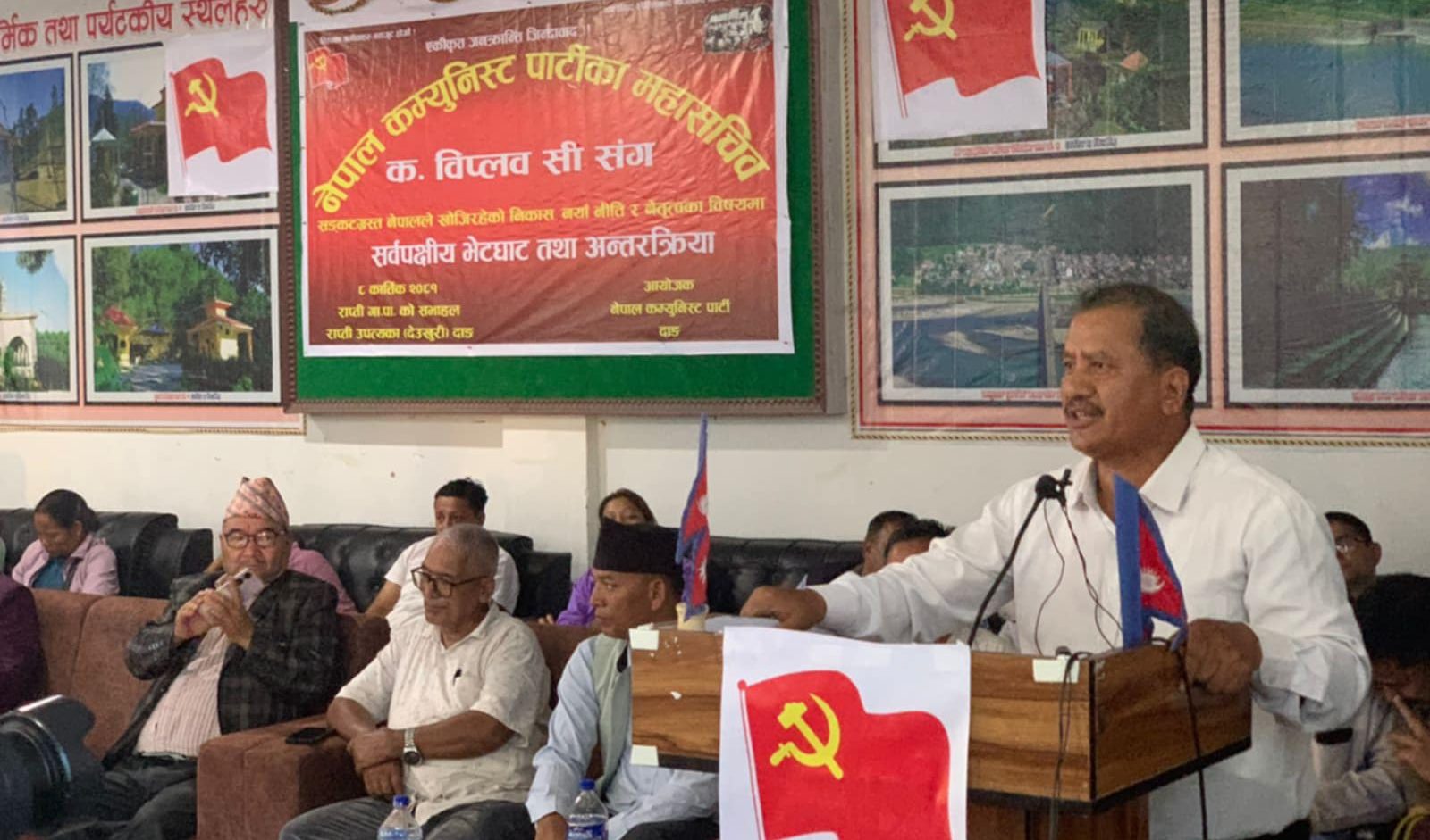 नेकपा दाङले देउखुरीमा आयोजना गरेको सर्वपक्षीय अन्तरक्रिया तथा भेटघाट कार्यक्रमलाई सम्बोधन गर्दैन महासचिव विप्लवले दलहरूले जनताको भावना समेट्न नसक्दा मुलुक अस्थिरता तर्फ धकेल्न खतरा बढेको बताए । संसदीय दलहरू असफल र बदनाम हुदै जादा जनतामा निराशा बढेको बताउदै विप्लवले यसको समाधान समाजवादी व्यवस्थाबाट मात्रै हुने दाबी गरे ।