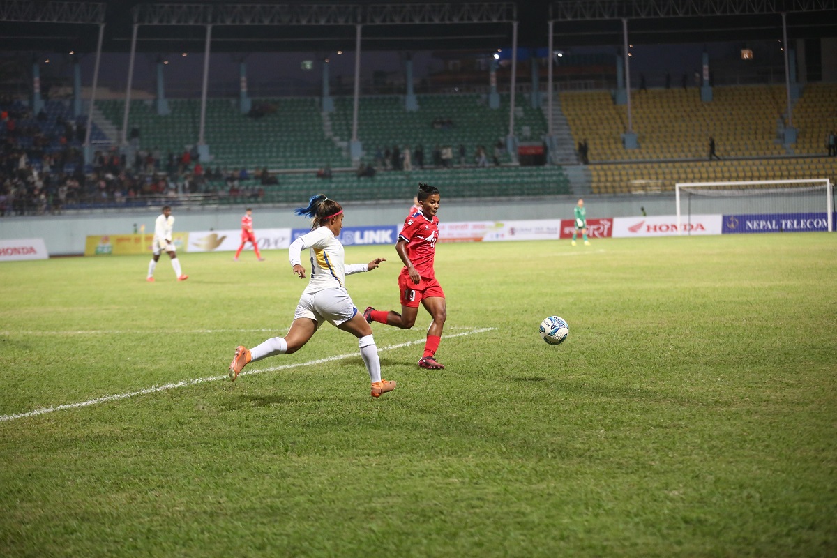 ११ औं मिनेटमा साम्बाले उत्कृष्ट गोल गरिन् । बिमला विकले दिएको पासमा पहिलो टच लिँदै डिफेन्डर बिट गरिन् र २५ यार्ड टाढाबाट सुन्दर गोल गरिन् । १३ औं मिनेटमा नेपालका लागि रेखाले गोल गरिन् । अमिषा कार्कीको क्रसमा रेखाले ६ यार्ड बक्स नजिकबाट पहिलो टचमै फिनिस गर्दै नेपाललाई ३-० ले अघि बढाइन् ।