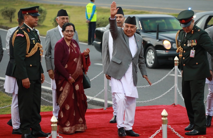 त्रिभुवन अन्तर्राष्ट्रिय विमानस्थलको अति विशिष्ट कक्षमा पौडेललाई उपराष्ट्रपति रामसहायप्रसाद यादव, प्रधानमन्त्री केपी शर्मा ओली र प्रतिनिधिसभाका सभामुख देवराज घिमिरेले बिदाइ गरे। यसअघि नेपाली सेनाको एक टुकडीले राष्ट्रपति पौडेलको सम्मानमा सम्मानगारत अर्पण गरेको थियो ।