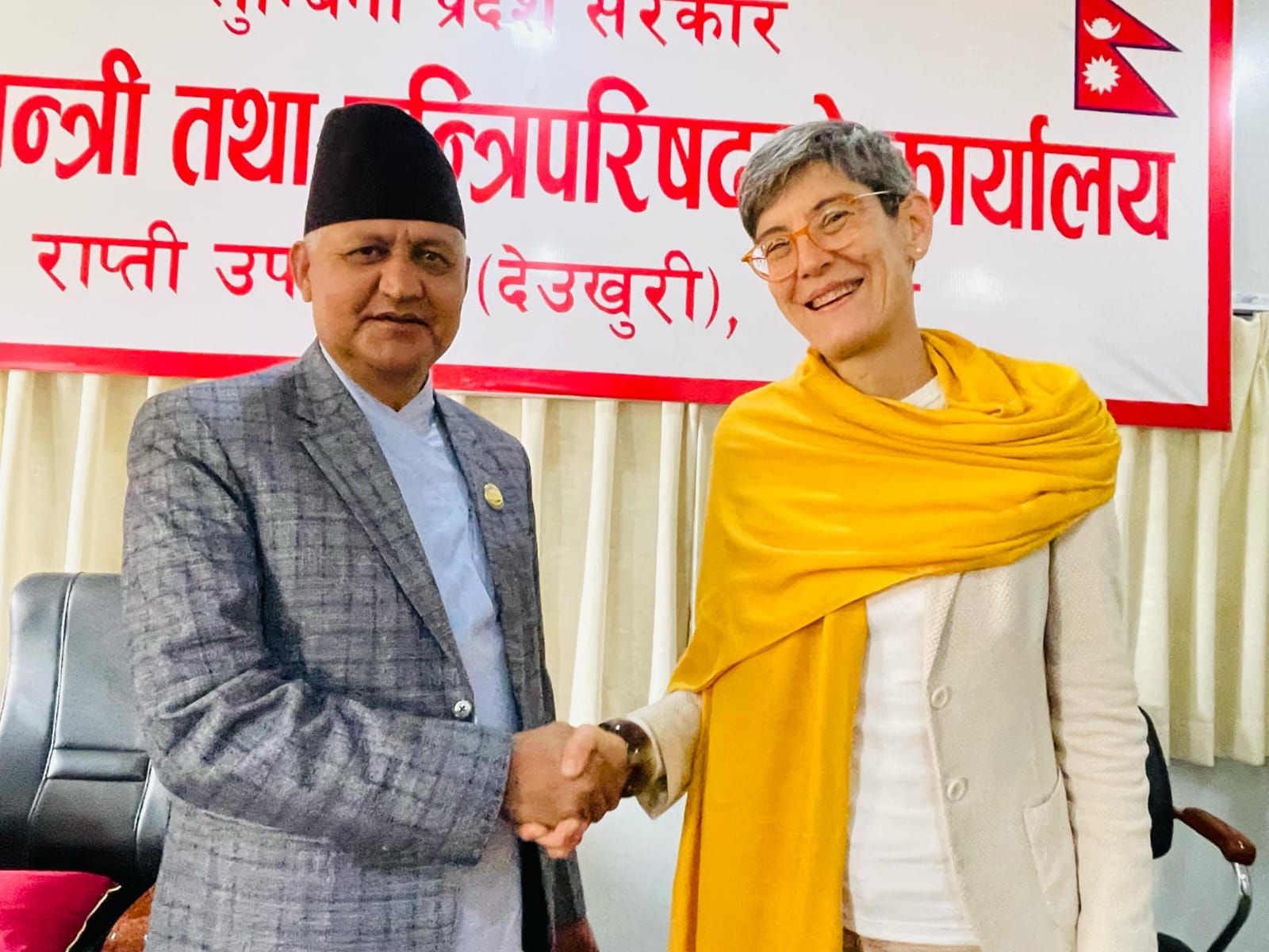 दाङ । लुम्बिनी प्रदेशका मुख्यमन्त्री चेतनारायण आचार्यसंग स्वीट्जरल्याण्डका राजदूत डानियल मेउल्ली मोन्टेलोने भेटवार्ता गरेका छन । मुख्यमन्त्री तथा मन्त्रिपरिषदको कार्यालय राप्ती उपत्यका देउखुरीमा शुक्रबार भएको भेटवार्तामा लुम्बिनी प्रदेशको विकास र समृद्धिमा स्विस सरकारले हाल गर्दै आएको सहयोगको बारेमा छलफल भएको छ ।