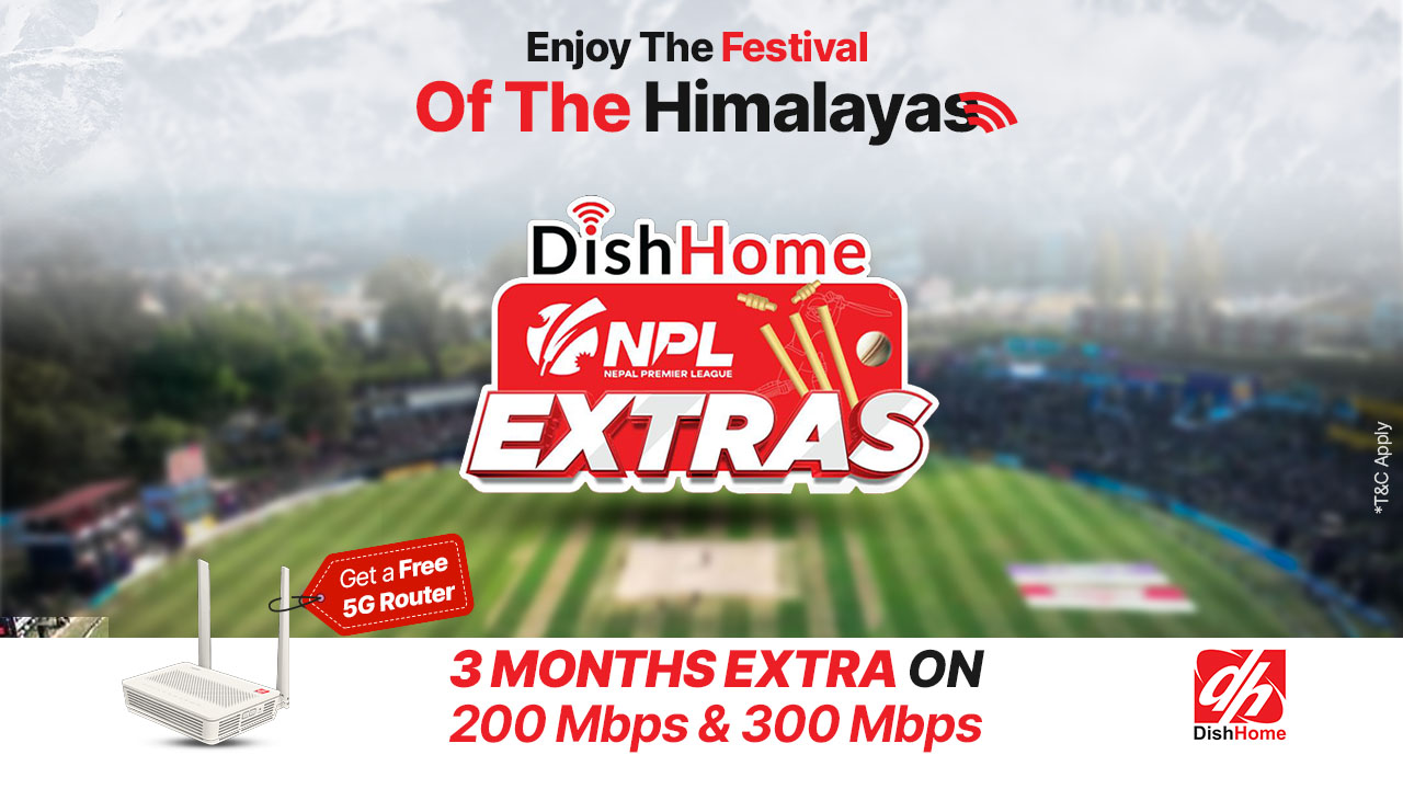 काठमाडौ । नेपाल प्रिमियर लिगको सुरूवातसँगै डिशहोमले एनपिएलका फ्यानहरूलाई लक्षित गर्दै आफ्नो ईन्टरनेट सेवामा आकर्षक अफर सार्वजनिक गरेको छ।