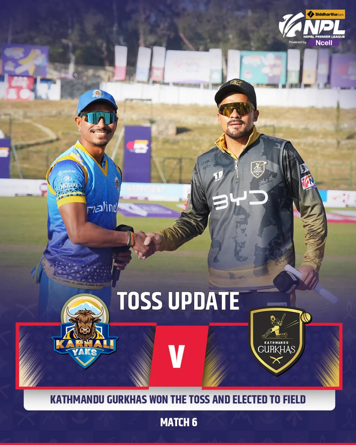 काठमाडौं । नेपाल प्रिमियर लिग (एनपीएल) को आजको पहिलो खेलमा कर्णाली याक्सविरुद्ध काठमाडौं गुर्खाजले टस जितेर बलिङ रोजेको छ । टियु क्रिकेट मैदानमा भएको टसमा काठमाडौंका कप्तान करण केसीले टस जितेर बलिङ रोजेका हुन् ।
