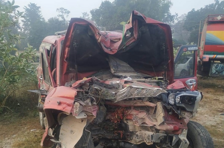 तीव्र गतिमा गुडिरहेको स्कर्पिओ अनियन्त्रित भएर सडकबाट तल खसेर रुखमा ठोक्किको थियो।