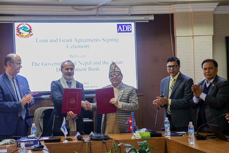 अर्थ मन्त्रालयमा आज आयोजित कार्यक्रममा ऋण एवं अनुदान सहायतासम्बन्धी सम्झौतापत्रमा अर्थसचिव डा रामप्रसाद घिमिरे र एडिबीका देशीय निर्देशक आर्नो कोश्वाले हस्ताक्षर गरे ।