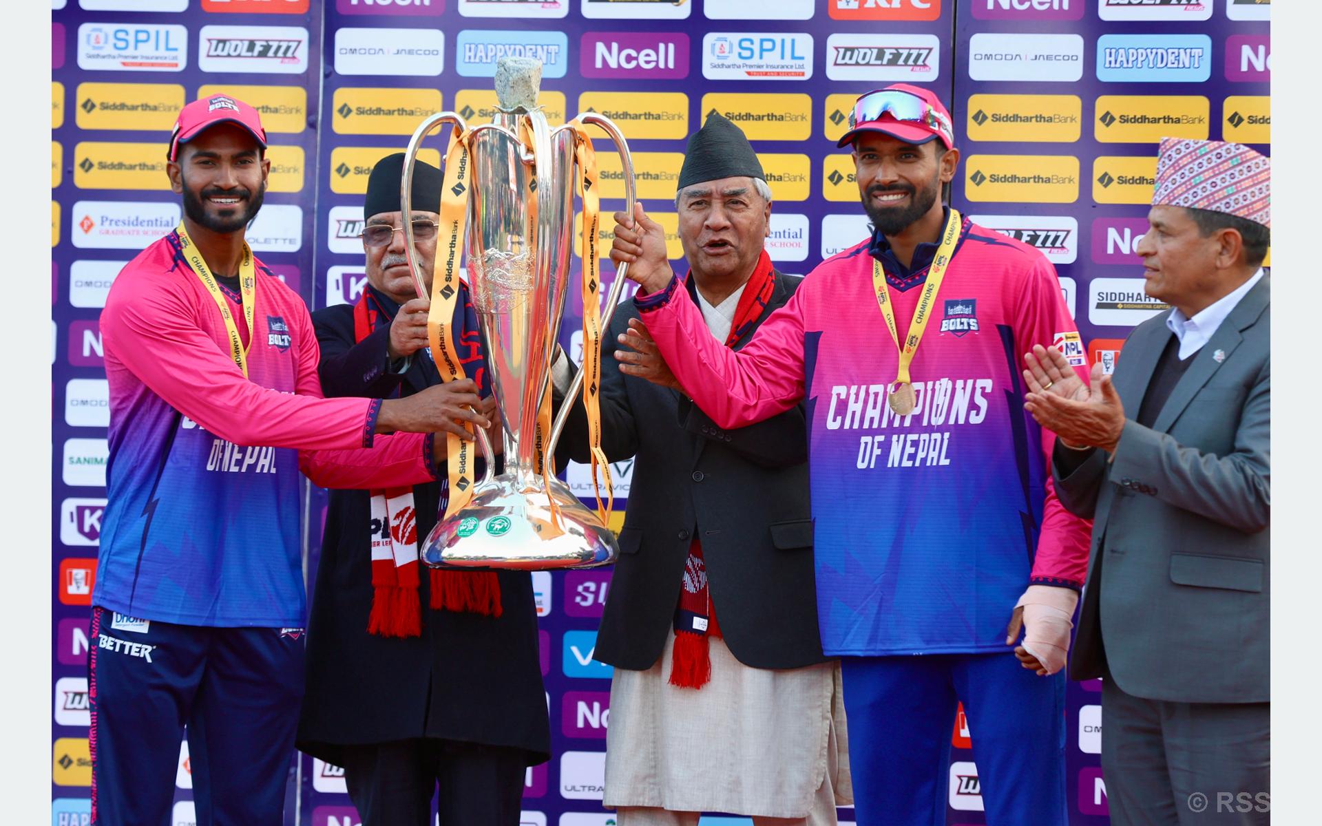 काठमाडौं । पहिलो संस्करणको नेपाल प्रिमियर लिग (एनपिएल)को उपाधि जित्ने जनकपुर बोल्ट्सले ट्रफिसहित रु एक करोड दश लाख प्राप्त गरेको छ ।