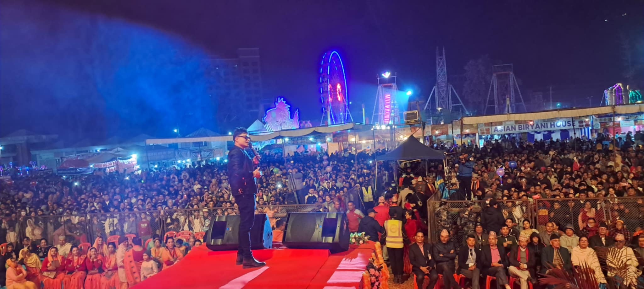 बुटवल । बुटवलमा जारी औद्योगिक व्यापार मेला २०८१ मा शनिबार चर्चित गायक पशुपति शर्मासँगै दर्शक झुमेका छन् । पशुपतिको प्रस्तुती पर्खेर बसेका हजारौं दर्शक उनी स्टेज चढेसँगै हुटिङले मेलास्थल गुञ्जिएको थियो ।
