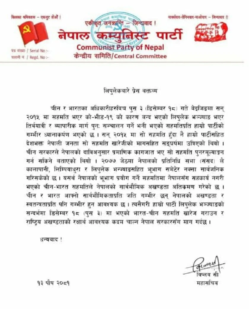 विज्ञप्तिमा भारत र चीनबीच भएको सो सम्झौताका विषयमा आफ्नो पार्टीको गम्भीर ध्यानाकर्षण भएको विप्लवले उल्लेख गरेका छन् । ‘चीन र भारतका अधिकारीहरूबिच पुस ३ (डिसेम्बर १८) गते बेइजिङमा सन् २०१५ मा सहमति भएर कोभिड १९ का कारण बन्द भएको लिपुलेक भन्ज्याङ भएर तीर्थयात्री र व्यापारिक मार्ग पुनः सञ्चालन गर्ने भनी भएको सहमतिप्रति हाम्रो पार्टीको गम्भीर ध्यानाकर्षण भएको छ ।’ विज्ञप्तिमा भनिएको छ ।