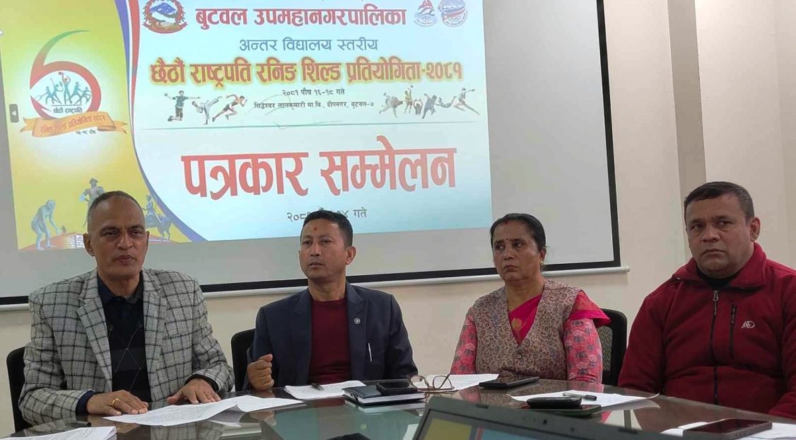 बुटवल । बुटवलमा अन्तर विद्यालय स्तरीय छैटौ राष्ट्रपति रनिङ शिल्ड प्रतियोगिता २०८१ को तयारी पुरा भएको छ । आइतबार पत्रकार सम्मेलनको आयोजना गरी प्रतियोगिताको सम्पूर्ण तयारी पुरा भएकोे नगर खेलकुद विकास समितिले जानकारी दिएको छ ।