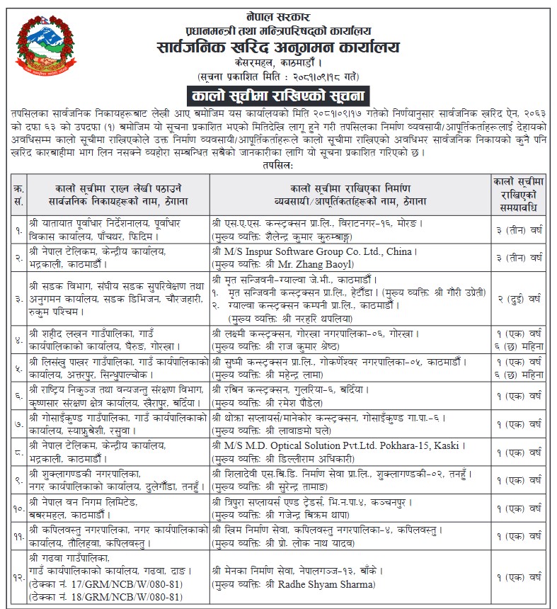 सूचनामा सार्वजनिक खरिद ऐन २०६३ को दफा ६३ ९१० अनुसार १२ कम्पनीहरूलाई कालोसूचीमा राखिएको उल्लेख गरिएको छ।
