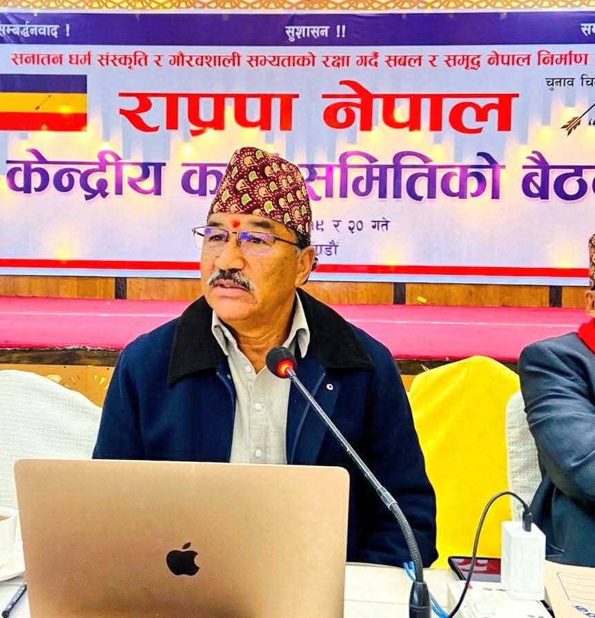 काठमाडौंको नवदुर्गा पार्टी प्यालेस, चावहिलमा बैठक चलिरहेको छ । हिजोको बैठकमा अध्यक्ष कमल थापाले मुलुकको समसामयिक परिस्थितिको समिक्षा र पार्टीको भाबी कार्यदिशा प्रस्तुत गरेका थिए ।