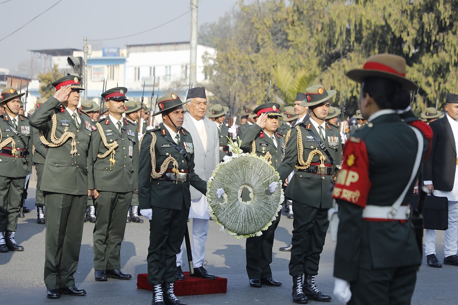 प्रमुख प्रशासनिक भवन सिंहदरबारको पश्चिम मूलगेटमास्थित पृथ्वीनारायण शाहको सालिक रहेको स्थानमा आयोजित कार्यक्रममा नेपाली सेनाले सम्मान गारत अर्पण गरेको थियो ।