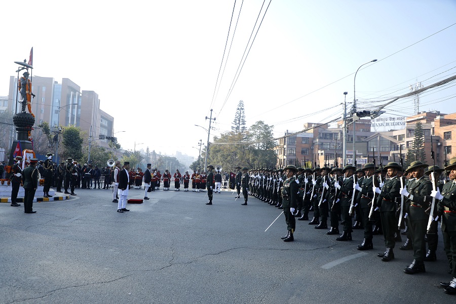 प्रमुख प्रशासनिक भवन सिंहदरबारको पश्चिम मूलगेटमास्थित पृथ्वीनारायण शाहको सालिक रहेको स्थानमा आयोजित कार्यक्रममा नेपाली सेनाले सम्मान गारत अर्पण गरेको थियो ।