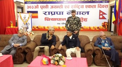 ३०३औं पृथ्वी जयन्ती एवं राष्ट्रिय एकता दिवसका अवसरमा शनिबार काठमाडौंमा चियापान कार्यक्रमको आयोजना गर्दै अध्यक्ष थापाले यसअघि सहकार्य गरेका र समान विचार भएकासँग आफूले एकता र सहकार्यको प्रयास गर्ने बताए।