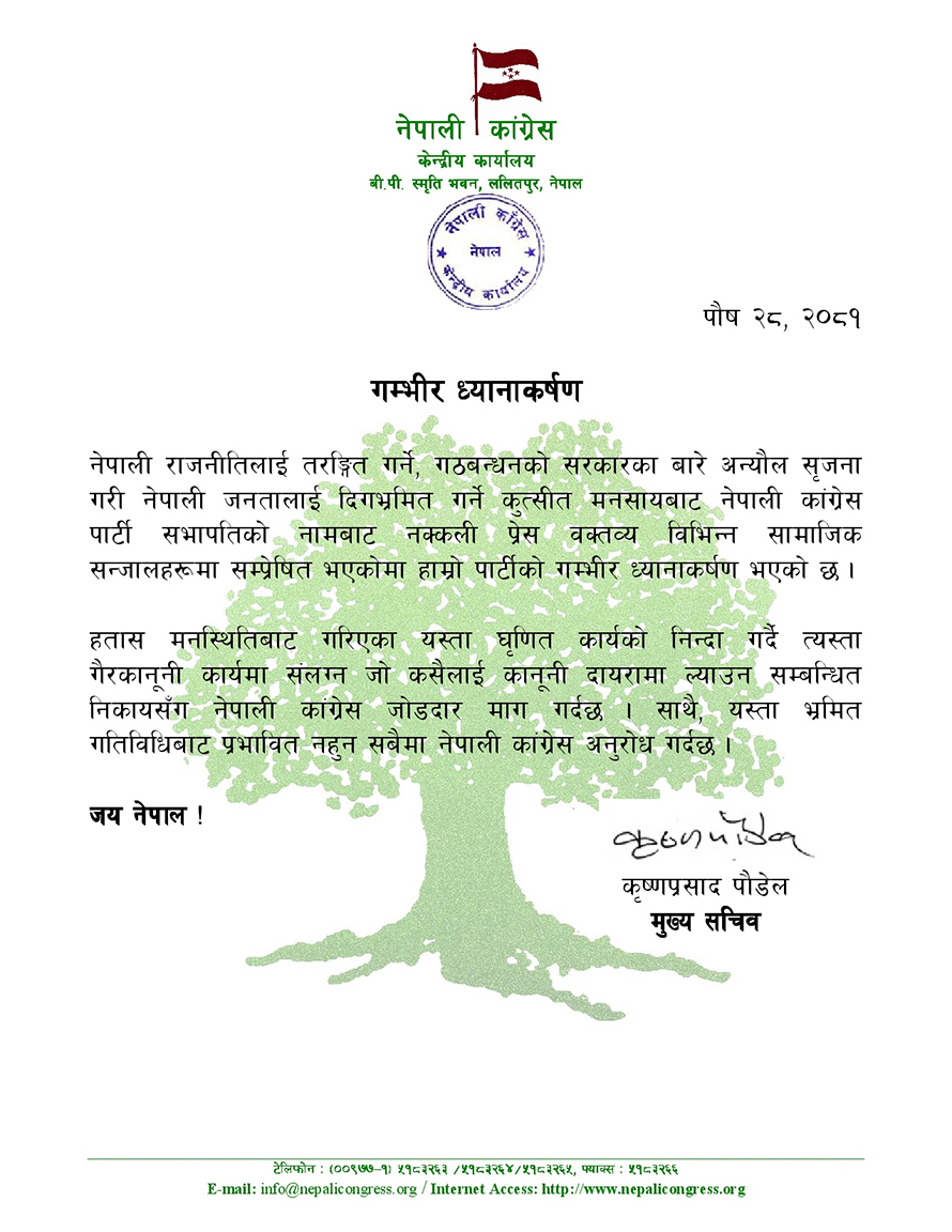 पार्टी मुख्‍यालयका मुख्‍य सचिव कृष्णप्रसाद पौडेलले आइतबार एक विज्ञप्ति जारी गर्दै पार्टीको सभापति देउवाको नामबाट जारी भएको भनिएको विज्ञप्ति नक्कली भएको उल्लेख गर्दै गम्भीर ध्यानाकर्षण भएको जनाएका हुन् ।