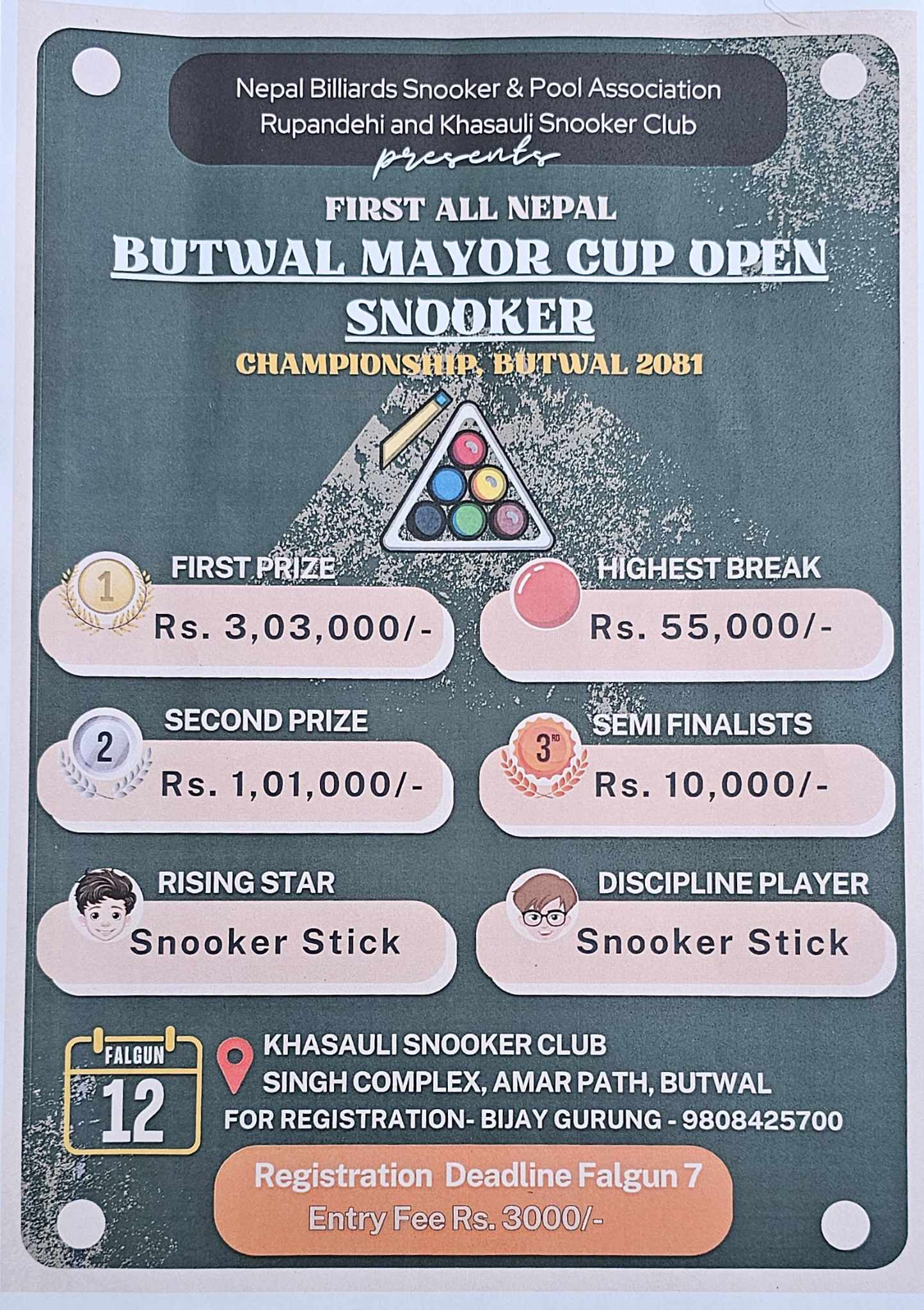 एशोसियशनले सोमबार पत्रकार सम्मेलन गरि फागुनको १२ गतेदेखि प्रथम अल नेपाल बुटवल मेयर कप ओपन स्नुकर प्रतियोगिता बुटवल २०८१ हुने लागेको बताएका छ । नेपाल बिलियार्ड स्नुकर एण्ड पुल एशोसियसन रुपन्देहीका अध्यक्ष सुजन पुनले रुपन्देहीमा सर्वाधिक राशीको प्रतियोगिता गर्न लागेको जानकारी दिए ।