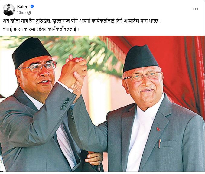 ‘अब खोला मात्र हैन टुडिखेल, खुल्लामन्च पनि आफ्नो कार्यकर्तालाई दिने अध्यादेश पास भएछ,’ सामाजिक सञ्जाल फेसबुकमा लेखेका छन, ‘बधाई छ, सरकारमा रहेका कार्यकर्ताहरुलाई ।’