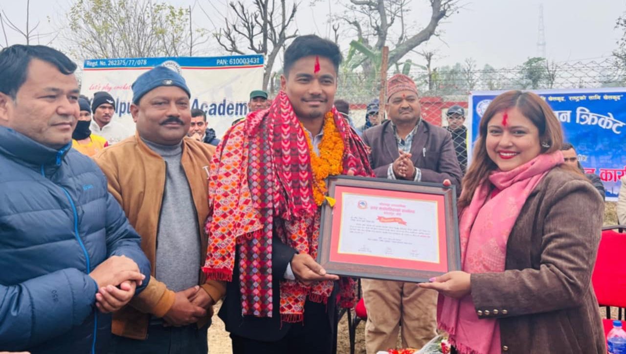 कोहलपुर । नेपाली राष्ट्रिय क्रिकेट टिमका कप्तान रोहित पौडेललाई बाँकेको कोहलपुरमा सम्मान गरिएको छ । कोहलपुरस्थित क्रिकेट मैदानको अवलोकनकालागी आइपुगेका कप्तान पौडेललाई स्थानीय सरकारका जनप्रतिनिधि तथा खेलप्रेमीहरुले सम्मान गरेका हुन् ।