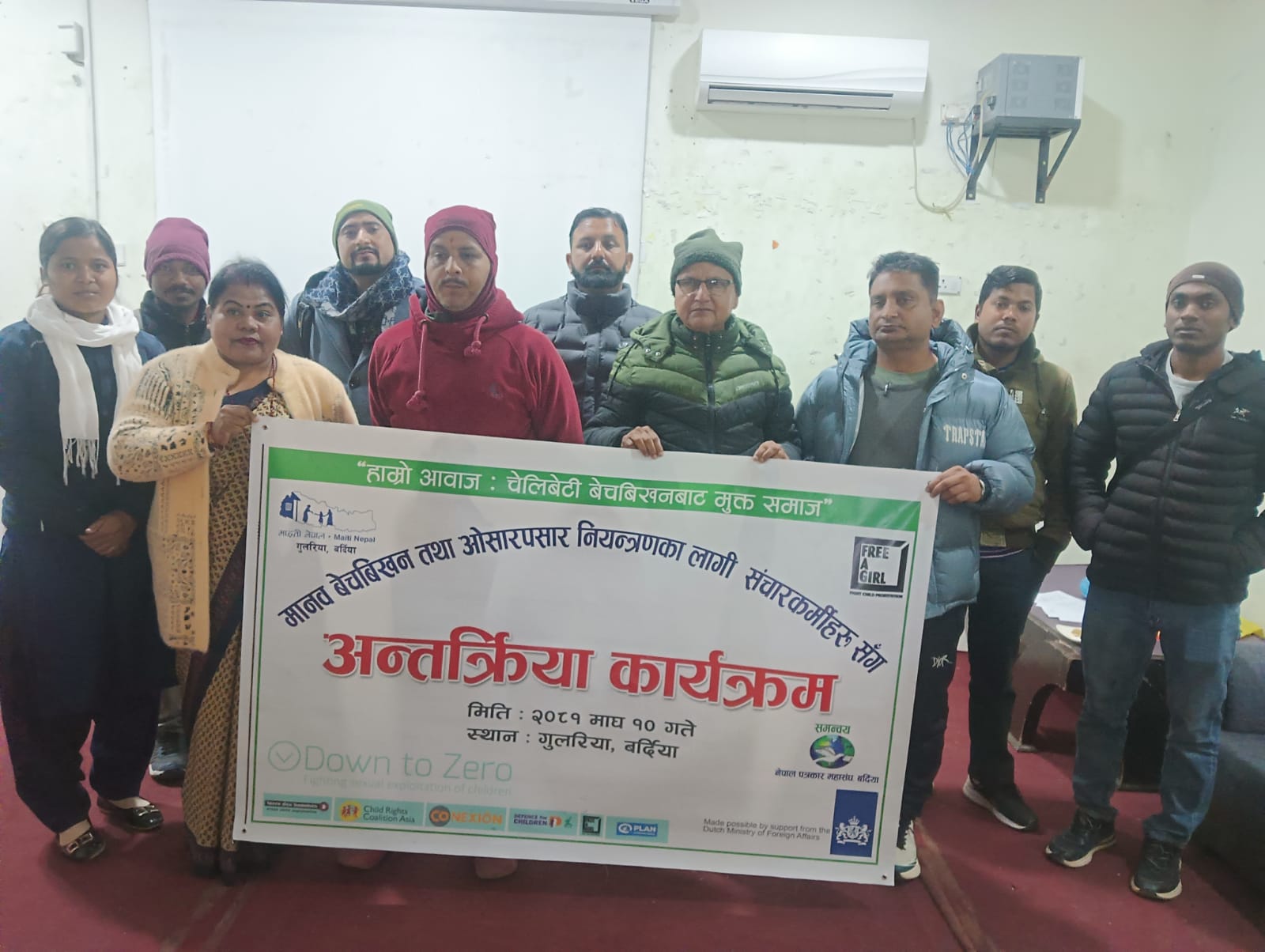 कार्यक्रममा नेपाल पत्रकार महासङ्घ बर्दियाका अध्यक्ष निर्मल घिमिरेले माइती नेपाल बर्दियाले मानव बेचबिखन नियन्त्रणमा उदाहरणीय काम गरेको बताउँदै मानव बेचविखन रोकथामको अभियानमा पत्रकारहरुले सँधै साथ दिने बताए ।