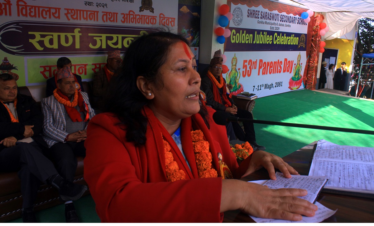 गोरखा नगरपालिका-८, आहालेस्थित श्री सरस्वती माध्यामिक विद्यालयको स्वर्ण जयन्ती तथा अभिभावक दिवस समारोहको समापन कार्यक्रमलाई शुक्रबार सम्बोधन गर्दै उनले शैक्षिक गुणस्तर अभिवृद्धिका लागि अहिलेको लगानी पर्याप्त नभएको बताइन् ।