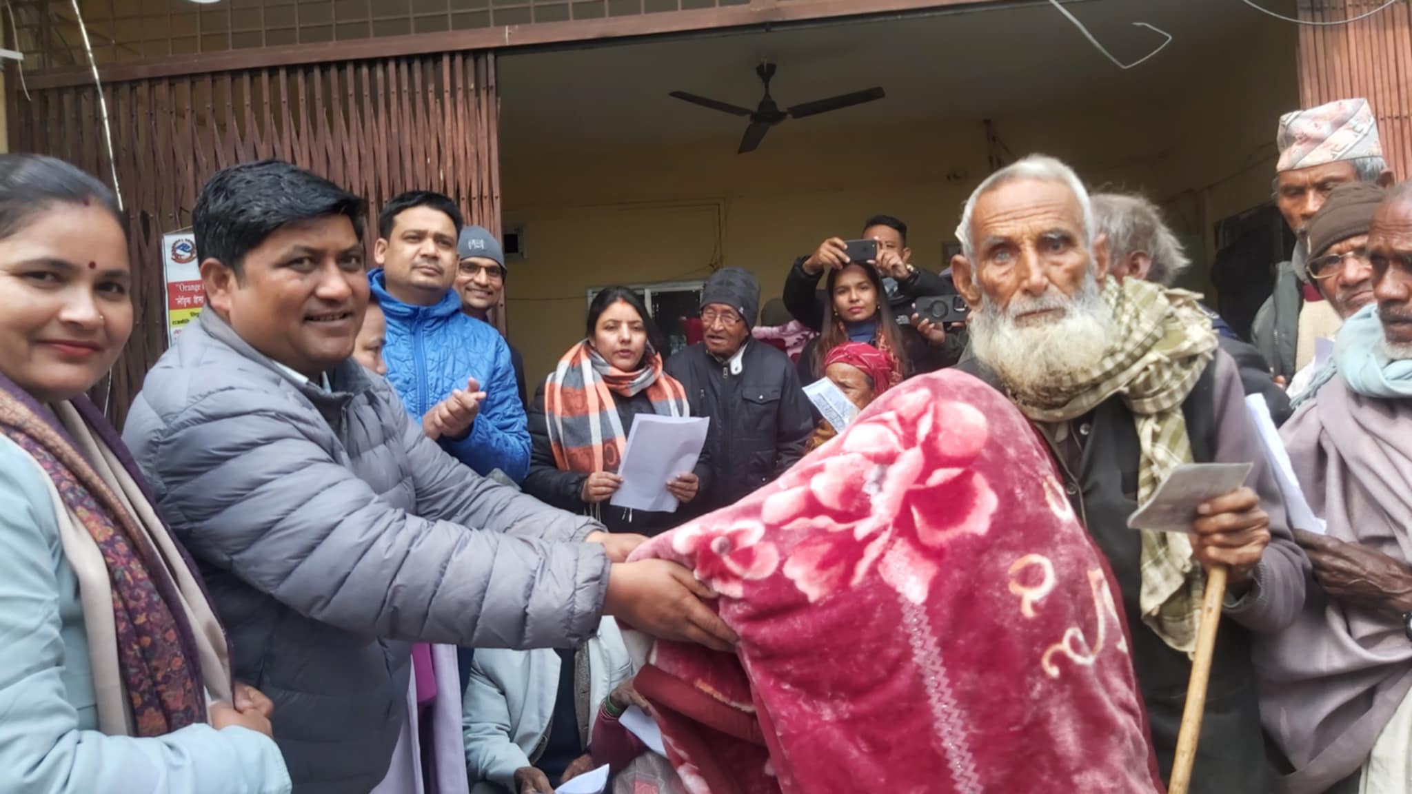 जेष्ठ नागरिकहरुलाई पालिका प्रमुख बिक, उपाध्यक्ष मन्जु मल्लले ब्लेङ्केट हस्तान्तरण गरेका थिए ।