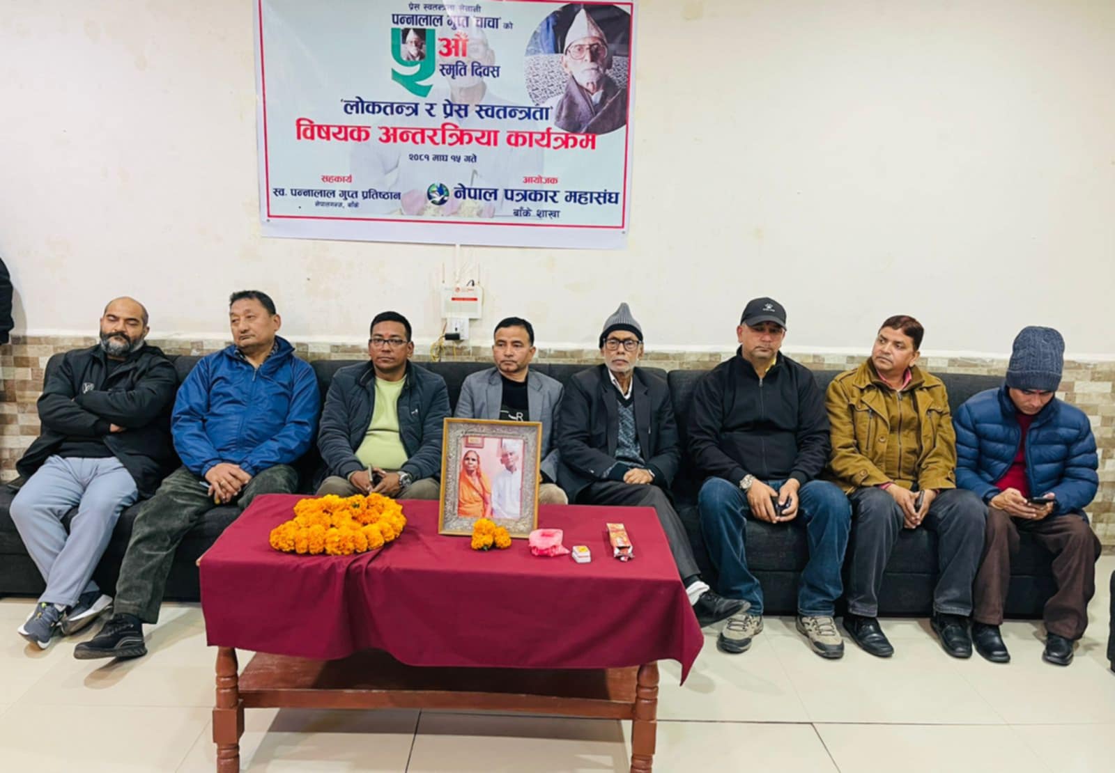 महासंघ बाँके शाखाको आयोजना एवम् स्व. पन्नालाल गुप्ता प्रतिष्ठानको सहकार्यमा लोकतन्त्र र प्रेस स्वतन्त्रता विषयक अन्तरक्रिया कार्यक्रममा नेपाली पत्रकारिताका ‘आदर्श’ गुप्ताको ब्यक्तित्व र कीर्तित्वमाथि चर्चा गरिएको छ । गुप्ताको अनुकरणीय ब्यक्तित्व नेपाली पत्रकारिताका लागि पाठशाला भएको भन्दै बक्ताहरुले उनको प्रेरणामा पत्रकारिता जगत सधैं सिंचित भइरहनुपर्नेमा जोड दिए ।