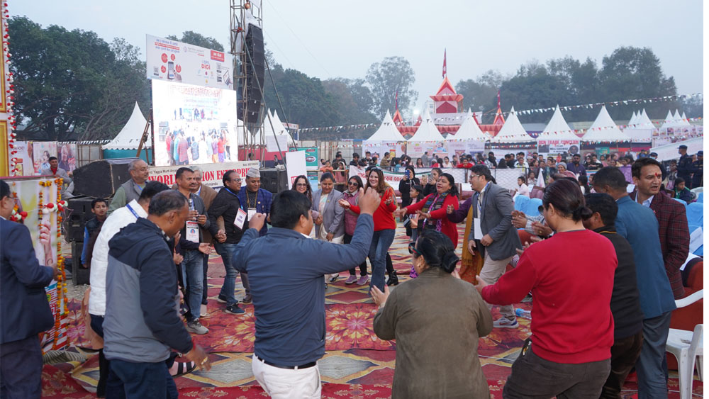 मञ्चको तलपट्टि अतिथि बसेको स्थलमा आयोजककोे छुट्टै समूह बन्यो । लुम्बिनी प्रदेशका पूर्वमन्त्री तथा प्रदेशसभा सदस्य कृष्णा केसी नमूना पनि संघका अध्यक्ष टंकबहादुर धामी नेतृत्वमा पदाधिकारी र सदस्य सम्मिलित समूहमा नाच्न थालिन् । भाका बुझे वा बुझेनन्, रुपैडिया नगरका मेयर डा.उमाशंकर वैश्य, रुपैडिया व्यापार मण्डल अध्यक्ष, महासचिव पनि हात, खुट्टाको तालमा ताल मिलाउँदै नाच्न थाले ।