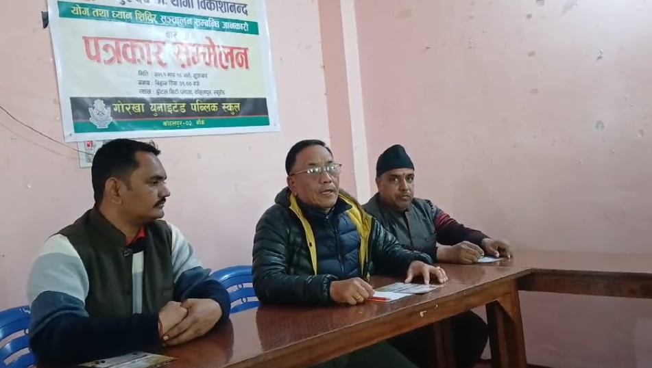 कोहलपुर । पश्चिम नेपालमै शिक्षा क्षेत्रमा ख्याती कमाएको कोहलपुरको गोरखा युनाईटेड पब्लिक स्कुलले सामाजिक उत्तरदायित्व अन्तर्गत बृहत योग तथा ध्यान शिविर संचालन गर्ने भएको छ । आज स्कुलले पत्रकार सम्मेलन गर्दै समाजलाई सकारात्मक दिशातर्फ लैजान सानो प्रयास स्वरुप योग तथा ध्यान शिवीर संचालन गर्न लागिएको गोरखा स्कुलले जनाएको छ ।