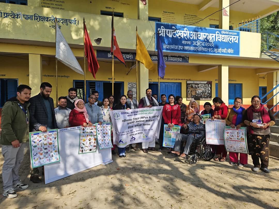 नेपालगन्ज । गोपाल–नीना फाउण्डेशनले स्वास्थ्य सतेचना कार्यक्रमसंगै शैक्षिक सामाग्री तथा व्हिल चियर वितरण गरेको छ । नेपालगन्ज–१८ स्थित पाटेश्वरी आधारभूत विद्यालयमा फाउण्डेशनद्वारा स्वास्थ्य सतेचना कार्यक्रमसंगै शैक्षिक सामाग्री तथा व्हिल चियर वितरण गरेको हो ।
