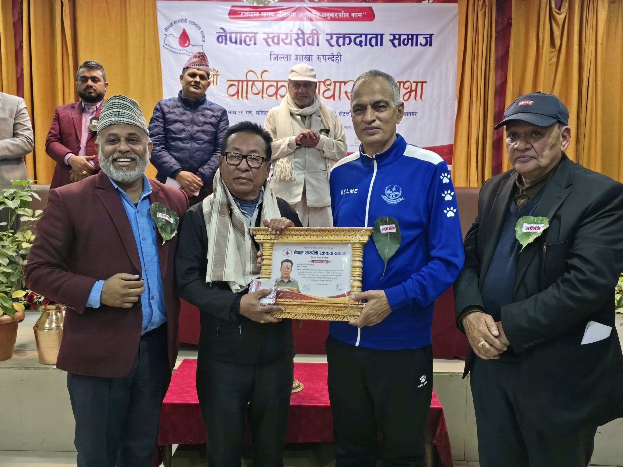बुटवल । नेपाल स्वयंसेवी रक्तदाता समाज रुपन्देही जिल्लाको १२ औं वार्षिक साधारण सभा बुटवलमा सम्पन्न भएको छ । कार्यक्रमको एक समारोहका बिच बुटवल उपमहानगरपालिकाका नगरप्रमुख खेलराज पाण्डेयले उद्घाटन गर्दै रक्तदान अभियान र बुटवलको पहिचानबारे प्रकाश पारे ।