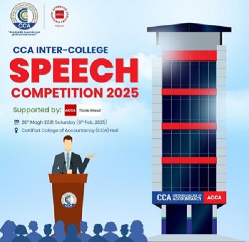 आगामी माघ २६ गते अर्थात्, फेब्रुअरी ८ मा सीसीए कलेजले अन्तर–विद्यालय वक्तृत्वकला प्रतियोगिता २०२५ गर्न लागेको हो ।