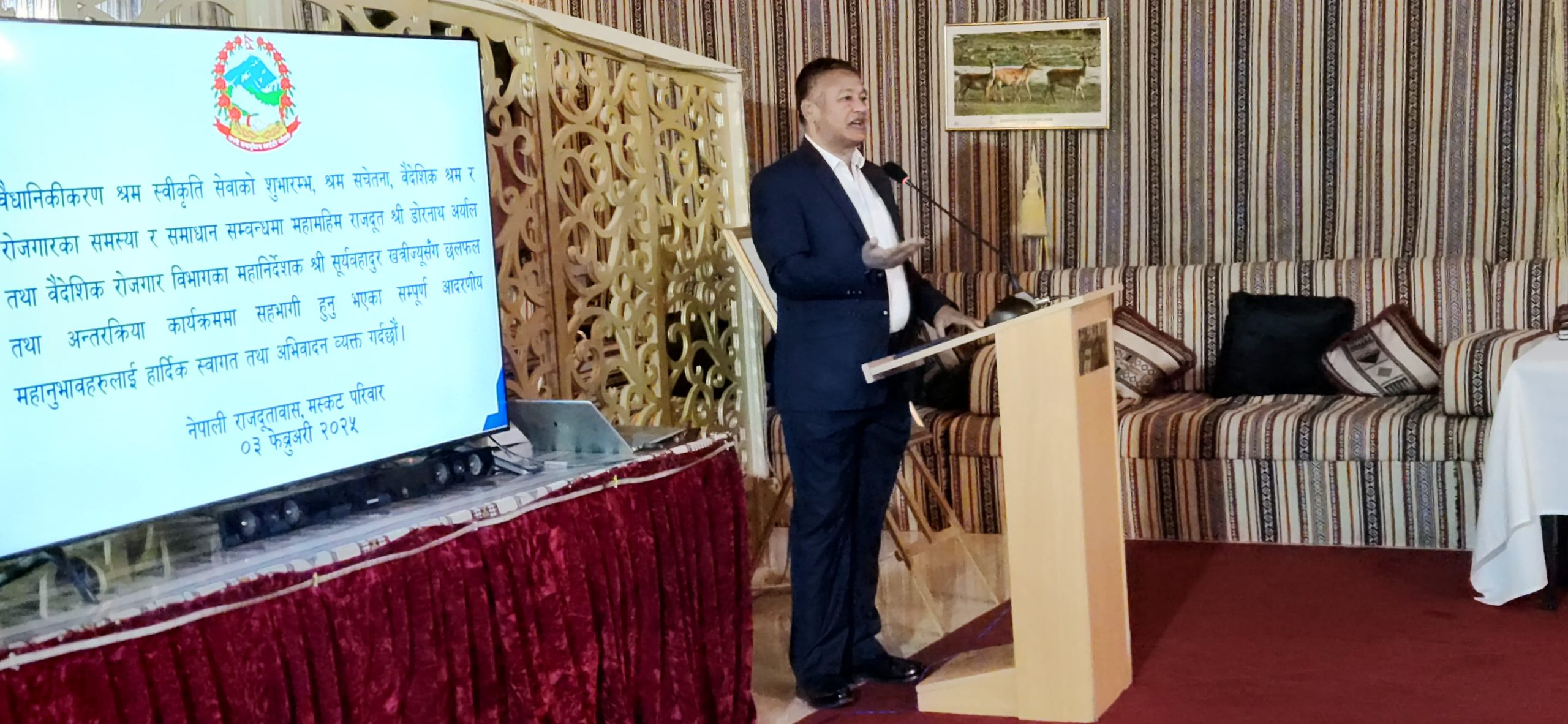 विभिन्न माध्यमबाट ओमान पुगेका तर श्रम स्वीकृति नभएका नेपालीलाई राजदूत डोरनाथ अर्याल र वैदेशिक रोजगार विभागका महानिर्देशक सूर्यबहादुर खत्रीले संयुक्त रुपमा श्रम स्वीकृति प्रदान गरेका हुन ।