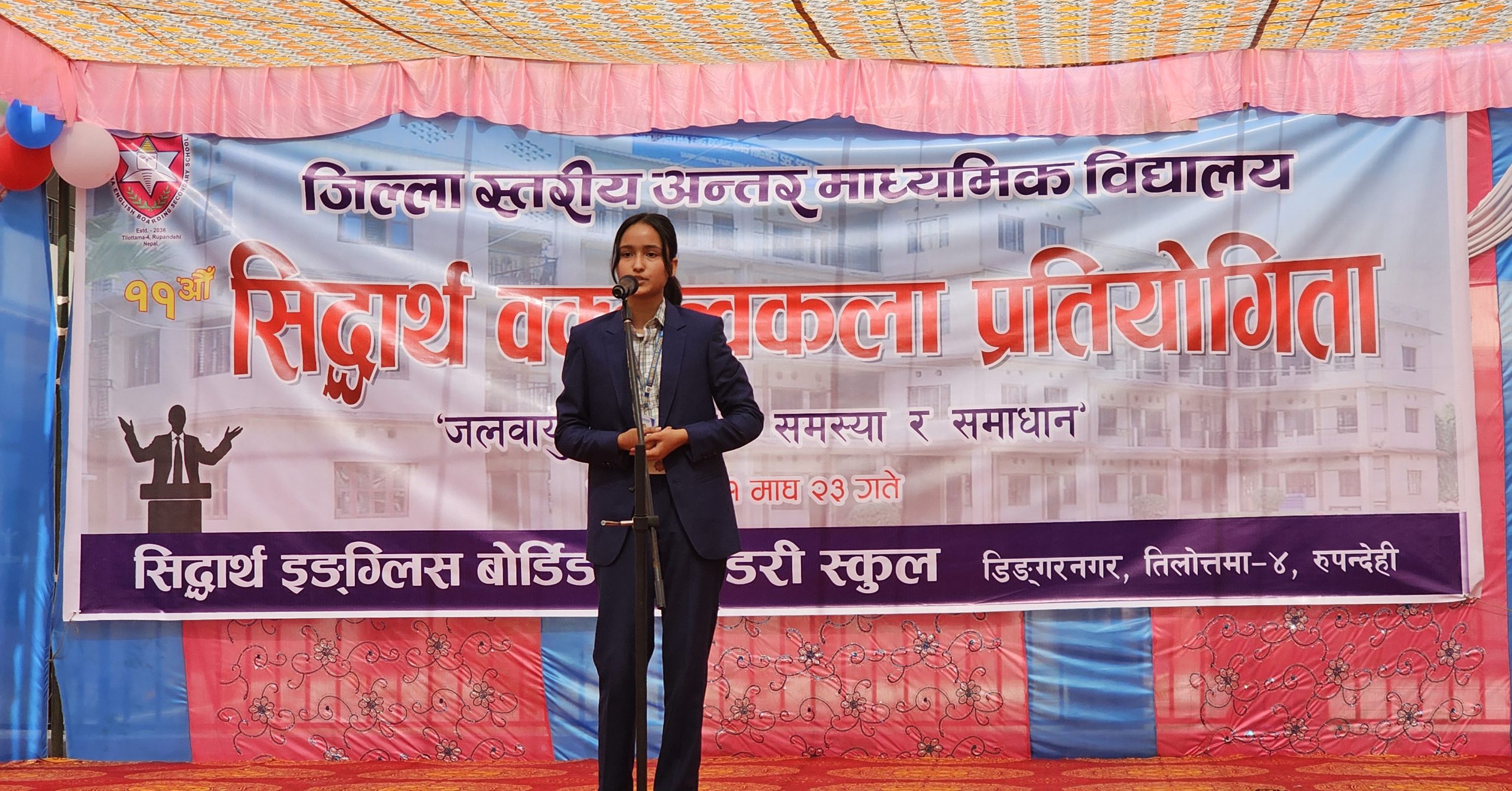 बुटवल । रुपन्देहीको तिलोत्तमा नगरपालिका-४ मा अवस्थित सिद्धार्थ ईङ्गलिस बोर्डिङ स्कूलमाको आयोजना जिल्ला स्तरीय अन्तरमावि ११ औं सिद्धार्थ वक्तृत्वकलाको उपाधि बुटवलको दीप बोर्डिङ हाई स्कुलकी आशिका थापाले हात पारेकी छन् । उपाधिसँगै उनले नगद १५ हजार, कप, मेडल र प्रमाणपत्र प्राप्त गरेका हुन् ।