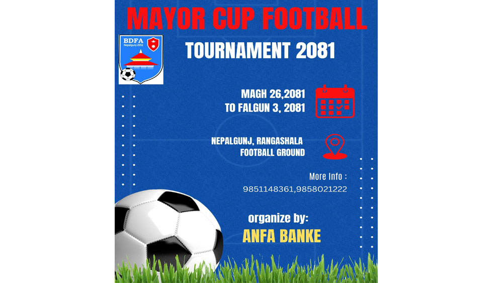 नेपालगन्ज । मेयर कप अन्तर विद्यालय छात्र–छात्रा फुटबल प्रतियोगिता– २०८१ शनिबार देखी नेपालगन्जमा सुरु हुँदैछ । बाँके जिल्ला फुटबल संघको आयोजनामा हुन लागेको प्रतियोगिताको उद्घाटन खेलमा डिफेन्डिङ च्याम्पियन नेपालगन्ज सेन्ट जेभिर्यस स्कुल र होप इन्टरनेसनल स्कुलले प्रतिस्पर्धा गर्दैछन् । नेपालगन्ज रंगशालामा हुने प्रतियोगिताको छात्र तर्फ २१ विद्यालयको सहभागिता रहेको छ ।