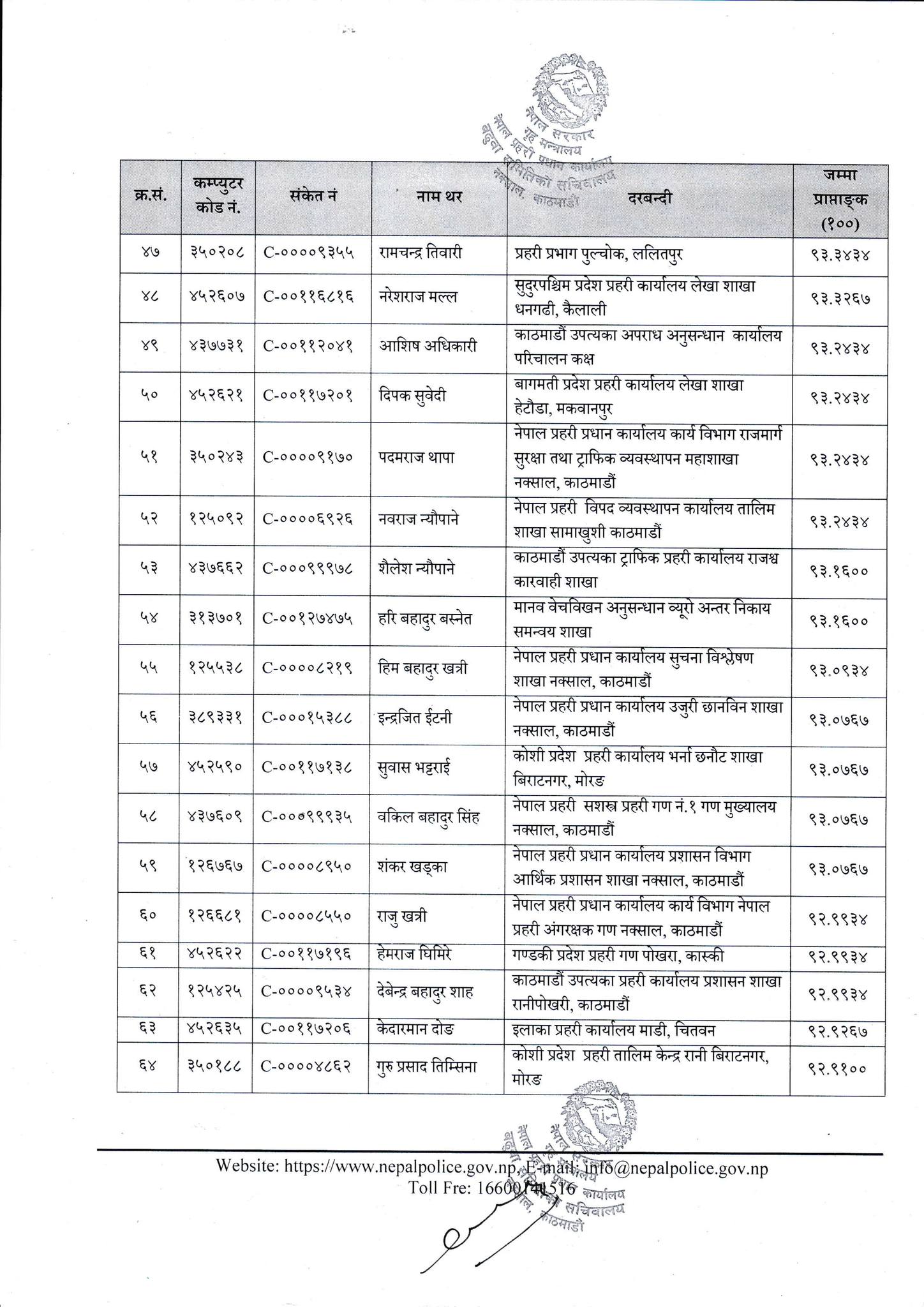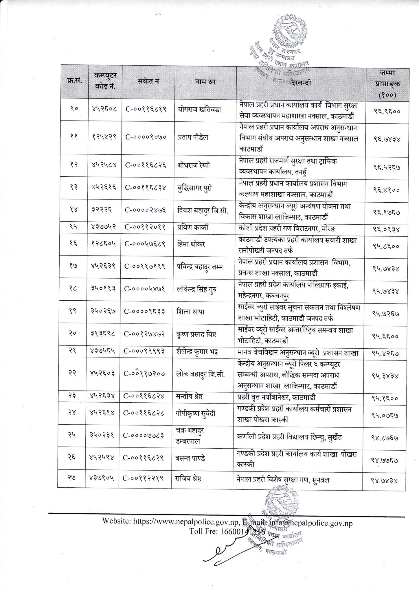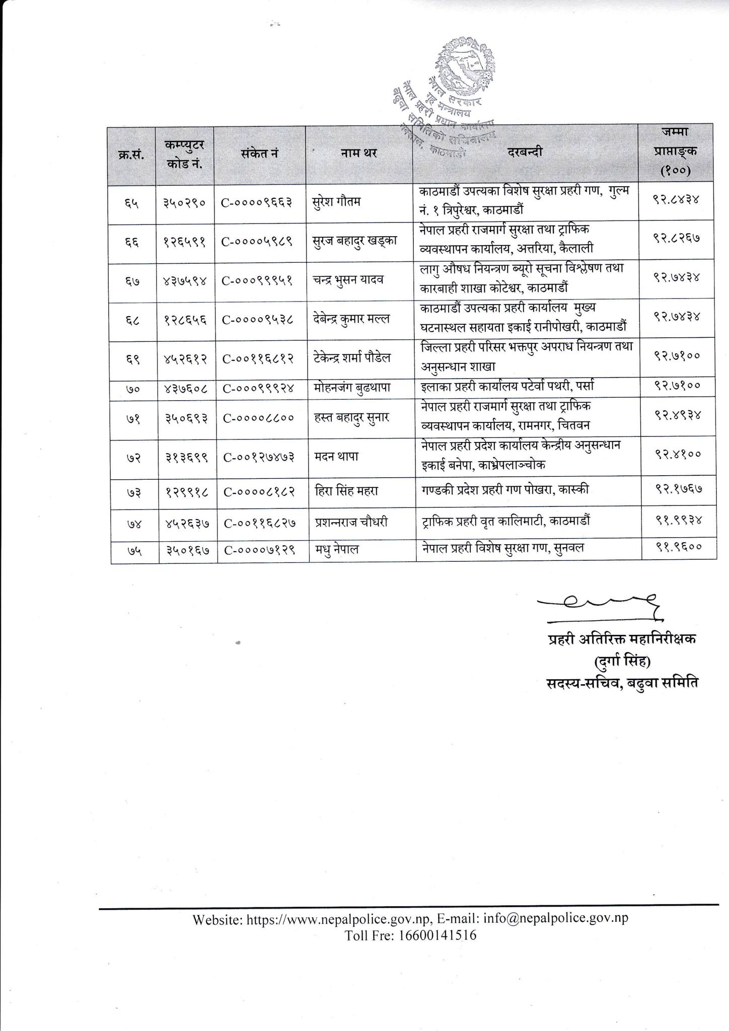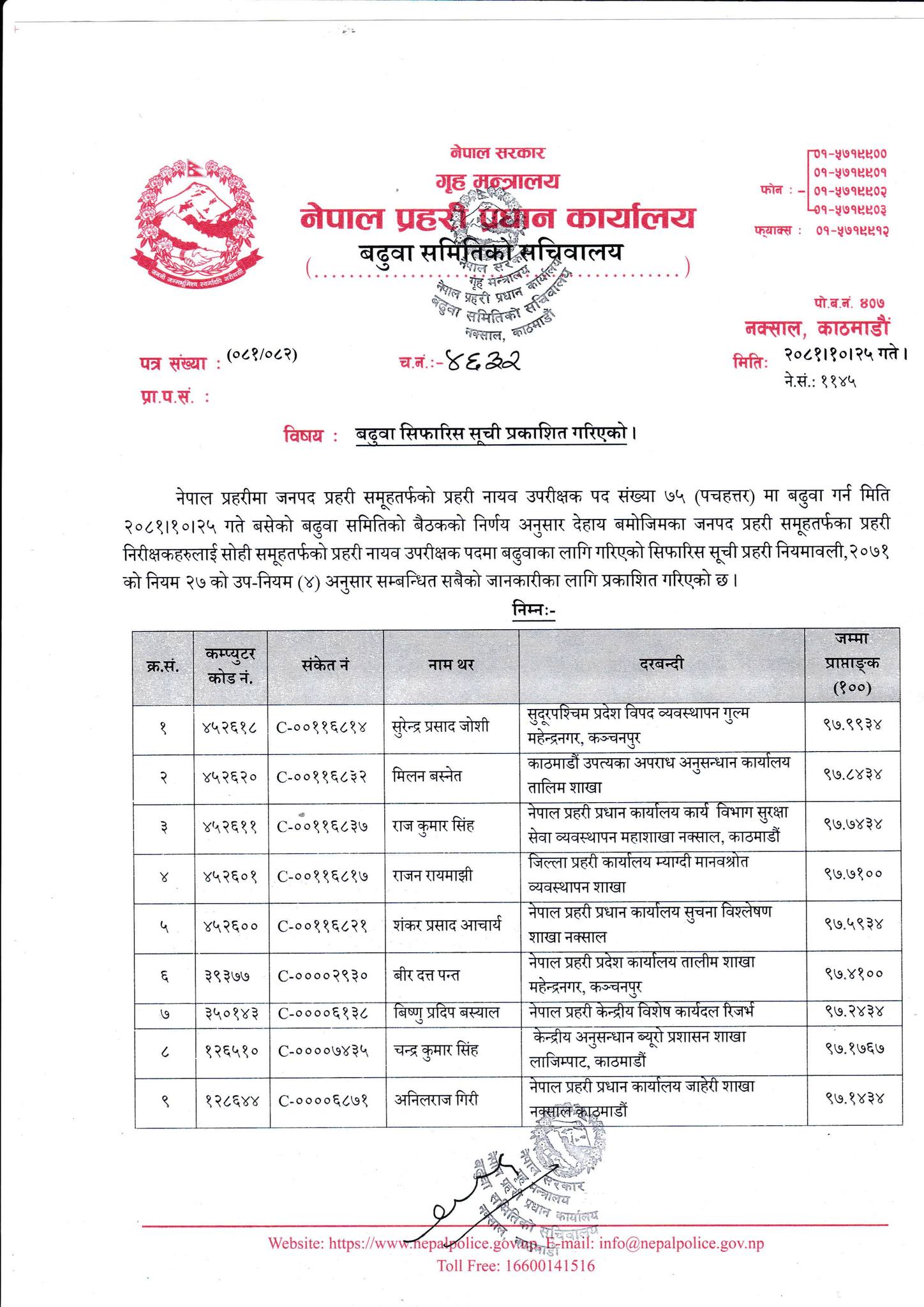 हिजो शुक्रबार बसेको बढुवा समितिको बैठकको निर्णयअनुसार उनीहरूलाई सोही समूहतर्फको प्रहरी नायव उपरीक्षक पदमा बढुवाका लागि सिफारिस गरिएको बढुवा समितिका सदस्यसचिवसमेत रहेका प्रहरी अतिरिक्त महानिरीक्षक दुर्गा सिंहले जानकारी दिए ।