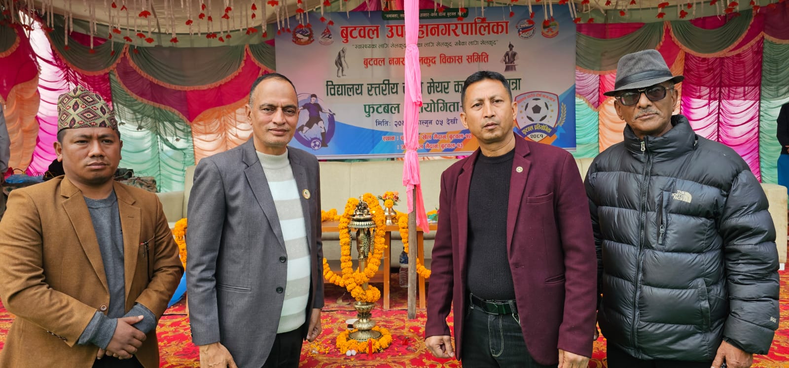 बुटवल । बुटवलमा आजदेखि अन्तर विद्यालयस्तरीय दोस्रो मेयर कप छात्र रछात्रा फुटबल प्रतियोगिता सुरू भएको छ । प्रतियोगिताको सोमबार बुटवल उपमहानगरपालिका वडा नं १२ तामनगर स्थित चारपाला खेलमैदानमा एक कार्यक्रमकाबीच बुटवल उपमहानगरपालिकाका नगर प्रमुख खेलराज पाण्डेयले उद्घाटन गरे ।