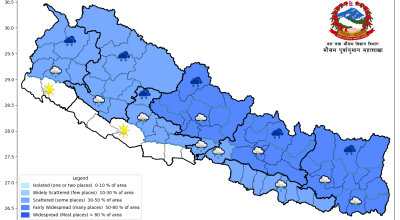 त्यसैगरी, आज राति देशका पहाडी भागमा आंशिकदेखि साधारणतया बदली रही बाँकी भेगमा मौसम सफा रहनेछ । कोशी, गण्डकी, कर्णाली र सुदूरपश्चिम प्रदेशका उच्च पहाडी तथा हिमाली भागका एक-दुई स्थानमा हल्का हिमपातको सम्भावना छ ।