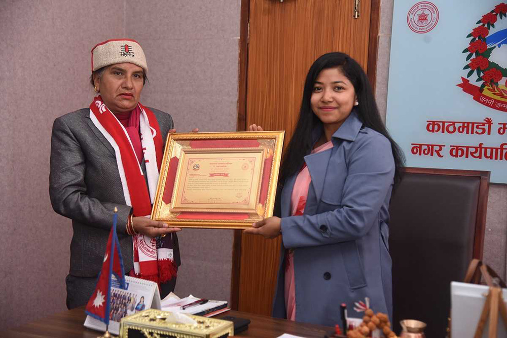 काठमाडौँ । काठमाडौँ महानगरपालिकाले बुलेट आमा शुशिला उप्रेती तिवारीको बुलेट मोटरसाइकल यात्राको प्रशंशा गरेको छ । आज उपप्रमुख सुनिता डंगोलले उनलाई प्रशंशा पत्र प्रदान गर्दै आगामी अन्तरदेशीय यात्रा सफलताको शुभकामना दिइन् ।
