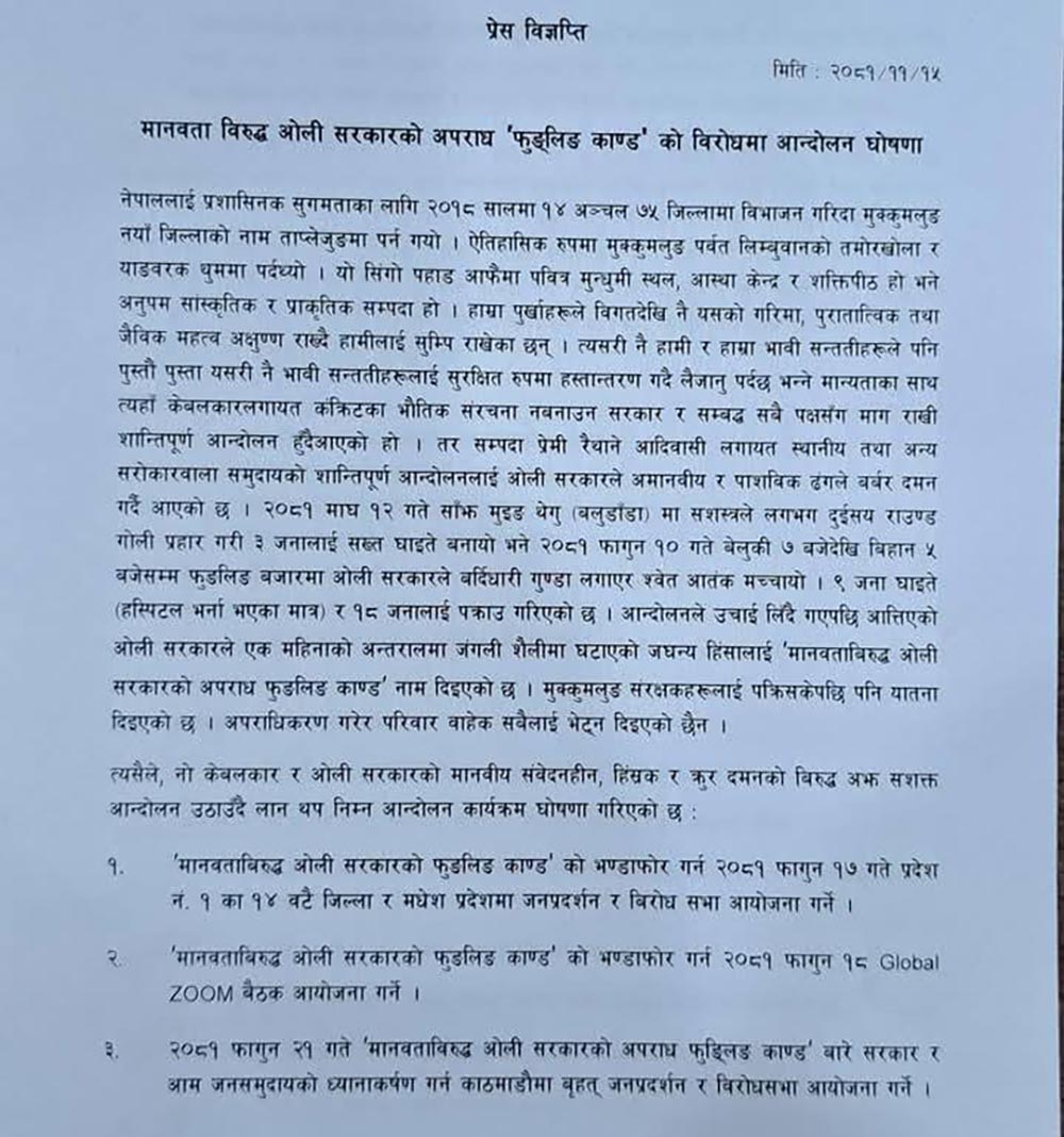 फागुन १८ गते ग्लोबल जुम बैठक गर्ने र त्यसको तीन दिनपछि काठमाडौंमा बृहत् जनप्रदर्शन र विरोध सभा गर्ने उल्लेख छ । साथै उनीहरूले ताप्लेजुङका प्रमुख जिल्ला अधिकारी नेत्रप्रसाद शर्मा र प्रहरी नायव उपरीक्षक रवि रावलका परिवारसहितको फोटो सार्वजनिक गर्ने र कारबाहीका लागि नेपाल सरकार र संयुक्त राष्ट्रसंघको सम्बन्धित निकायमा उजुरी दिने कार्यक्रम घोषणा गरेका छन् ।