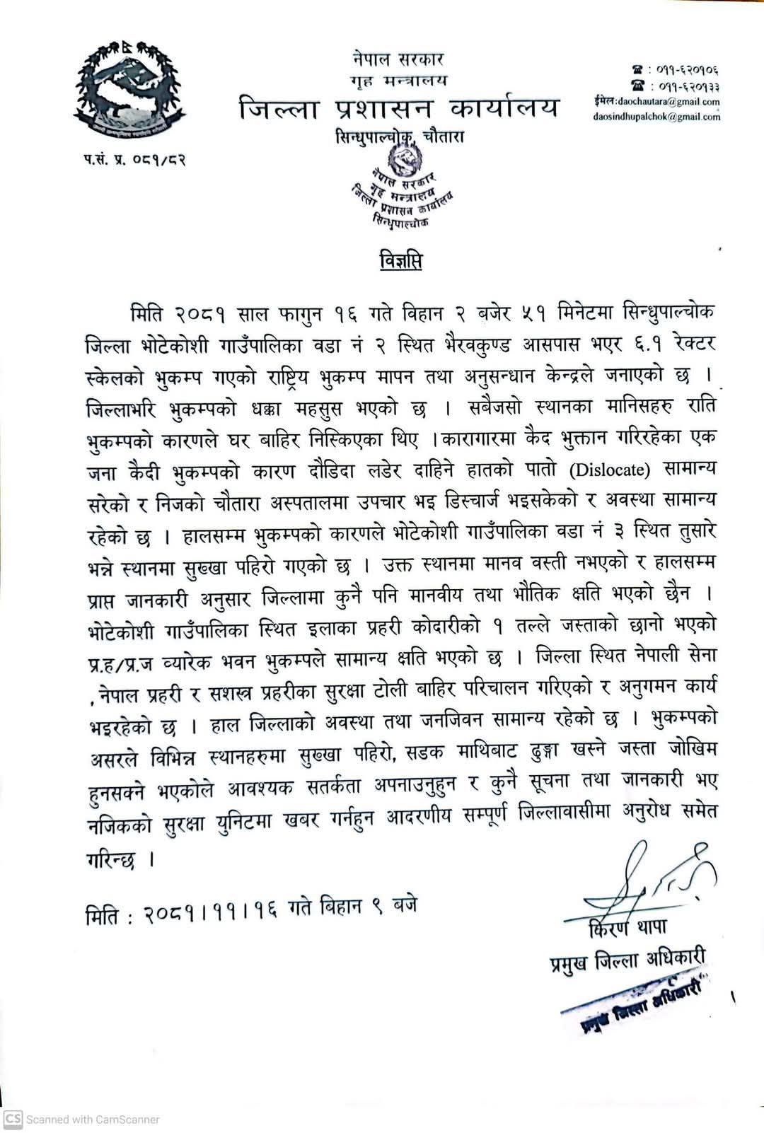 भूकम्पबाट कुनै मानवीय र भौतिक क्षति भएको छैन : सिन्धुपाल्चोक प्रशासन