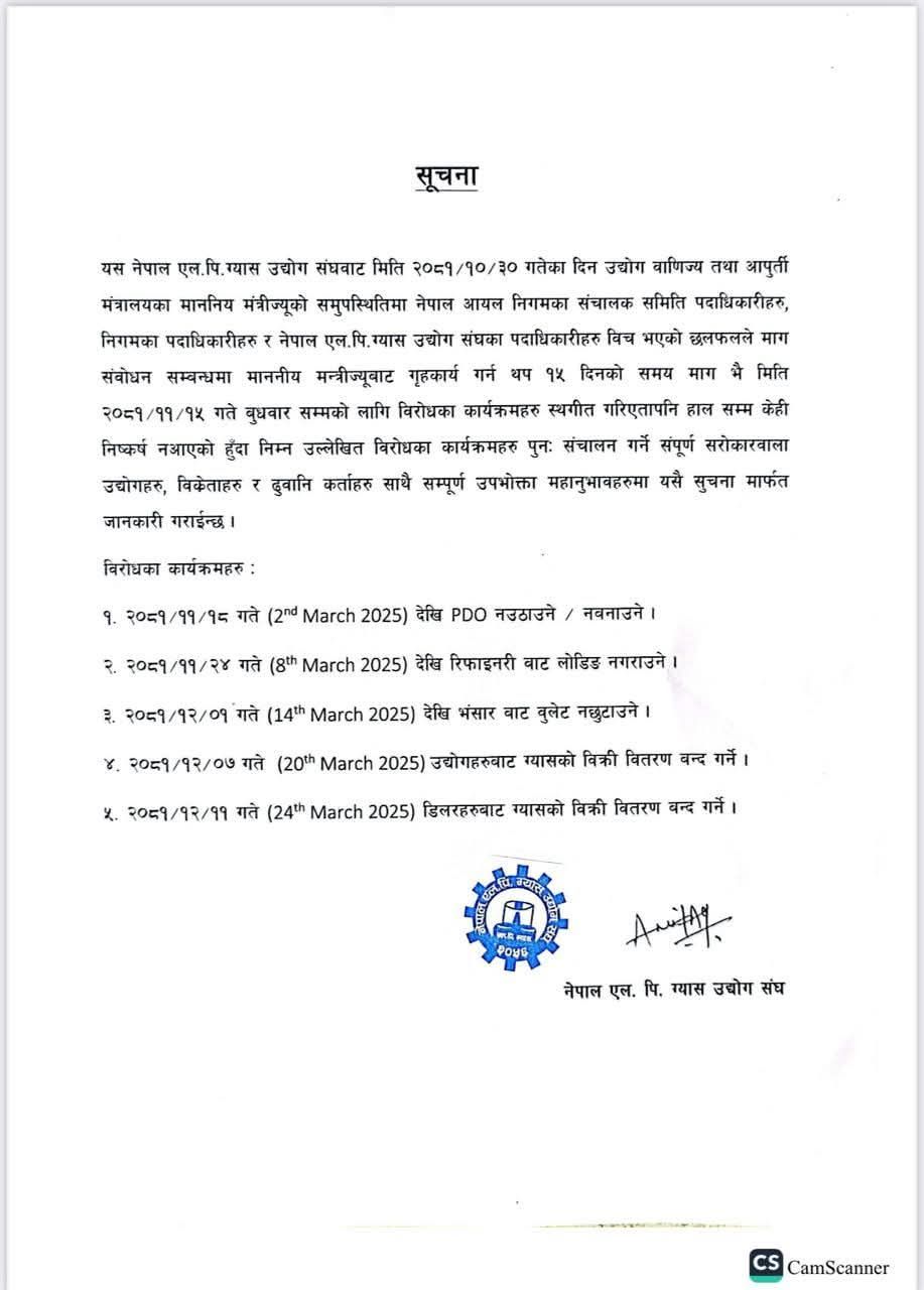 उद्योगीहरुको कार्यक्रममा फागुन १८ गतेदेखि पिडीओ नउठाउने।नवनाउने, २४ गतेदेखि रिफाइनरीबाट लोडिङ नगराउने, चैत्र १ गतेदेखि ग्यास बुलेट भन्सारबाट नछुटाउने, चैत्र ७ गतेबाट उद्योगाहरुबाट ग्यासको विकी वितरण बन्द गर्ने र चेत्र ११ गतेबाट डिलरहरुबाट ग्यासको विकी वितरण बन्द गर्ने रहेका छन् ।
