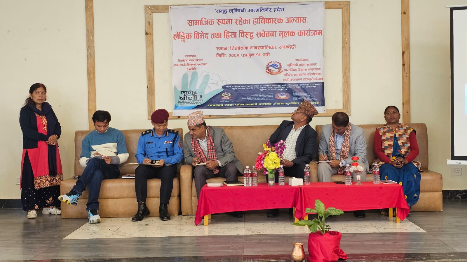कार्यक्रममा लुम्बिनी प्रदेश सामाजिक विकास मन्त्रालयका सचिव अणप्रसाद न्यौपाने, महिला विकास अधिकृत सम्झना सुवेदी, ईलाका प्रहरी कार्यालय बुटवलका डिएसपी ईन्द्र बहादुर राना लगायतले लैंगिक विभेद किन र कसरी हुन्छन् ?, घटना बारे प्रहरीकहाँ जानकारी गराउन के गर्नुपर्छ ? महिलामाथि बढीरहेको हिंसा रोक्न महिलाको भुमिका कस्तो हुने ? जस्ता विषयमा प्रशिक्षण दिएका थिए ।
