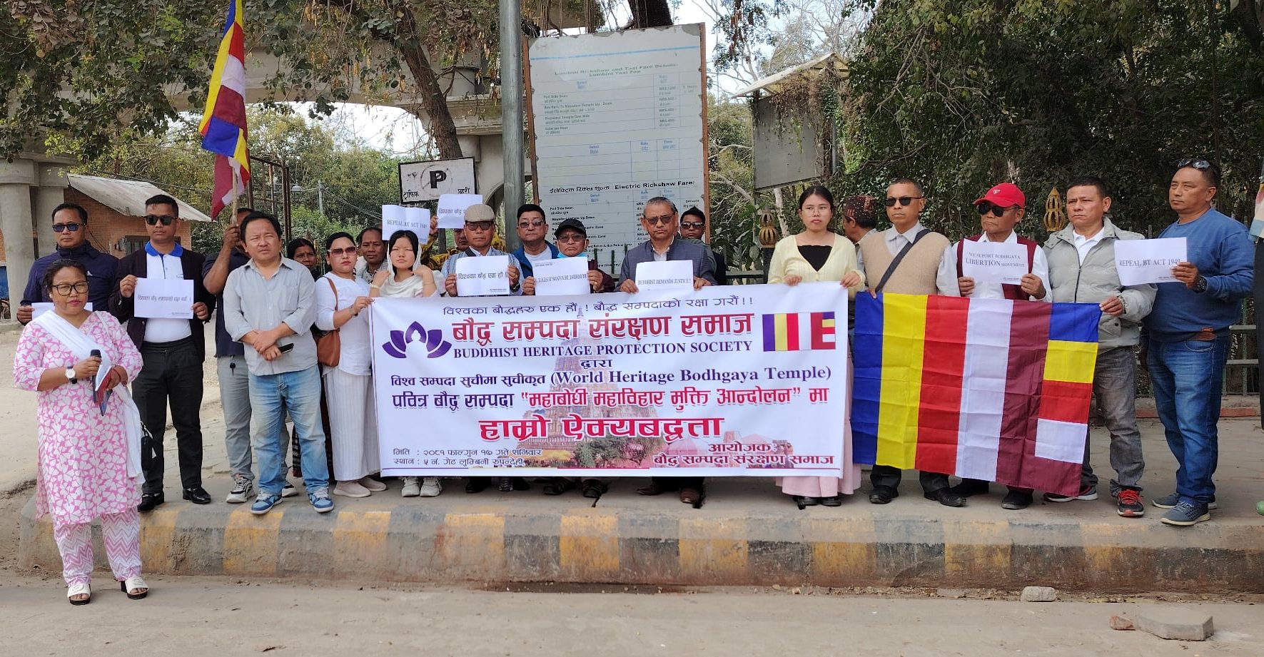 लुम्बिनी । भारतको बोधगयामा बौद्ध अनुयायीहरु माथि भारत सरकारले गरेको दमनका विरोध गर्दै बौद्ध सम्पदा संरक्षण समाजले अनुयायीहरुको न्यायका लागि एक्यबद्धता जनाएको छ । शनिबार बुद्धजन्मस्थल लुम्बिनी स्थित महिलवारमा प्रदर्शन गर्दै बोधगयामा बौद्धमार्गीहरु प्रति भईरहेको दमन रोक्न र गैरबुद्ध समुदायलाई बोधगयाको व्यवस्थापनबाट हटाउन माग गर्दै एक्यबद्धता प्रदर्शन गरेको हो ।