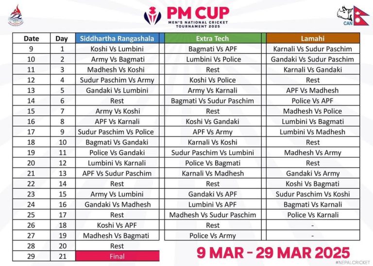 बुटवल । नेपाल क्रिकेट संघ (क्यान) को आयोजनामा आजदेखि प्रधानमन्त्री कप (पीएम कप) एकदिवसीय पुरुष राष्ट्रिय क्रिकेट प्रतियोगिता सुरु हुँदैछ । आजदेखि चैत १६ गतेसम्म लुम्बिनी प्रदेशका तीन शहरमा हुने पीएम कपमा सात प्रदेश र तीन विभागीयसहित १० टिम सहभागी हुँदै छन् ।