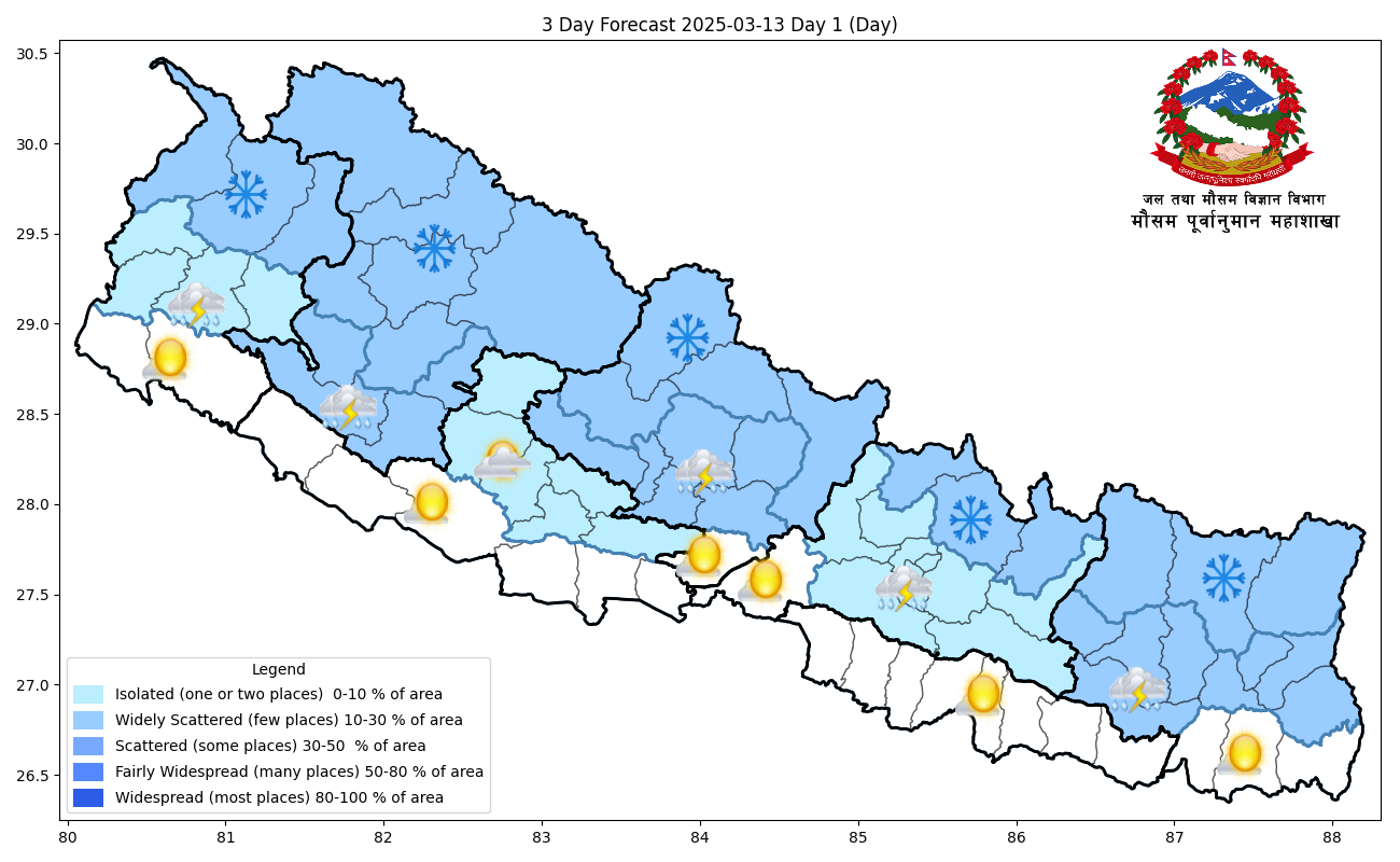 देशको उच्च पहाडी तथा हिमाली भागका एक-दुई स्थानमा हल्का हिमपातको सम्भावना छ । कोशी, गण्डकी र कर्णाली प्रदेशका पहाडी भू-भागका केही स्थान तथा बाँकी प्रदेशका पहाडी भागका एक-दुई स्थानमा मेघगर्जन र चट्याङसहित हल्का वर्षा हुने सम्भावना रहेको जनाउँदै महाशाखाले यसबाट दैनिक जनजीवन, स्वास्थ्य, सडक तथा हवाईउड्डयनमा आंशिक प्रभाव पर्न सक्ने भएकाले सावधानी अपनाउन सम्बद्ध सबैमा अनुरोध गरेको छ ।